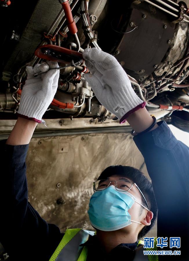 2月3日,南航河南公司机务工程师魏文楷在检修飞机辅助动力装置。新华社记者 李安 摄