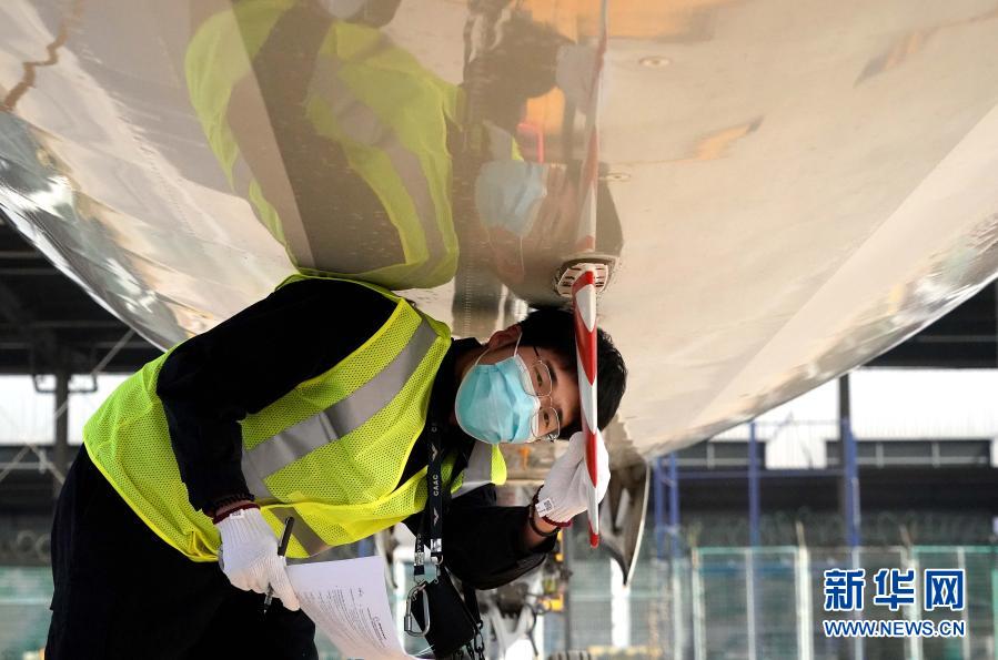 2月3日,南航河南公司机务工程师魏文楷检查飞机甚高频天线的完好性。新华社记者 李安 摄