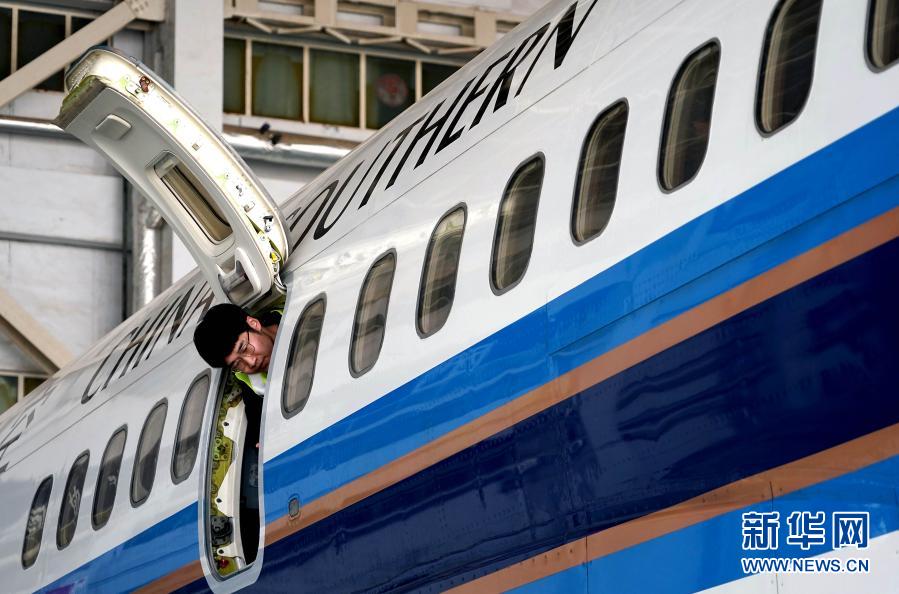 2月3日,南航河南公司机务工程师魏文楷在维修机库检查定检飞机舱门。新华社记者 李安 摄