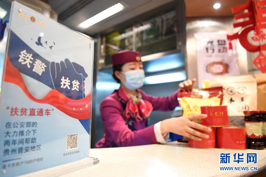 2月4日,D6186次列车上的乘务员在整理来自贵州省普安县的扶贫农产品。