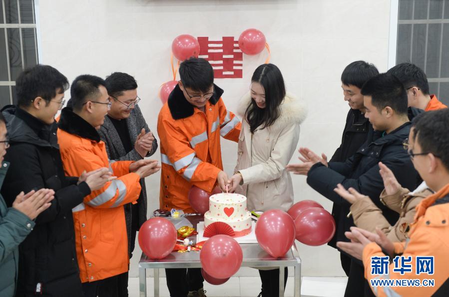 1月20日,孙京南和李亚营在切婚礼蛋糕。新华社记者 季春鹏 摄