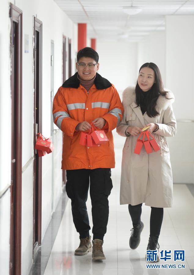 1月21日上午,工作到凌晨5点的工友还在熟睡,孙京南、李亚营将喜糖悄悄挂在他们宿舍门上。新华社记者 季春鹏 摄