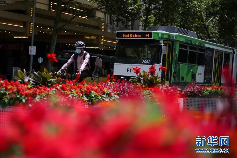 2月4日,一名自行车骑手在澳大利亚墨尔本戴口罩出行。