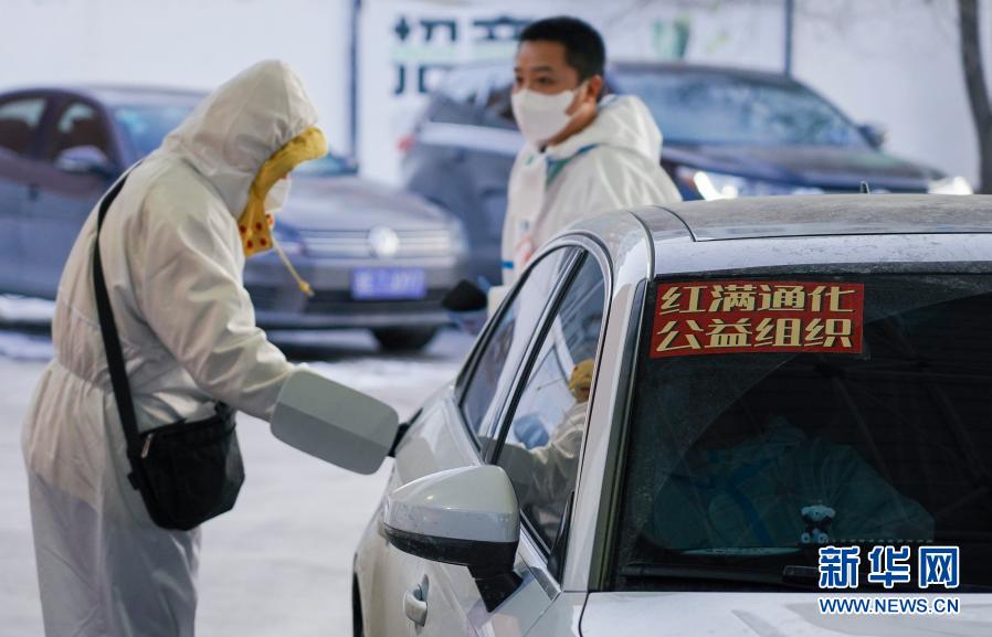 在位于吉林省通化市东昌区的中国石油秀泉加油站,志愿者王哲(右)等待加油站工作人员为车辆加油(2月2日摄)。