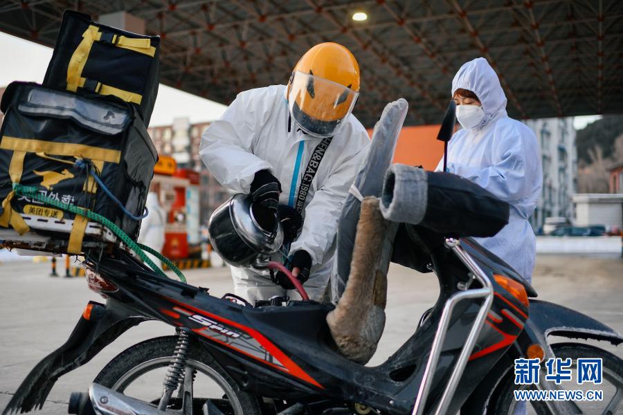 在位于吉林省通化市东昌区的中国石油秀泉加油站,一名外卖配送员为摩托车加油(2月2日摄)。
