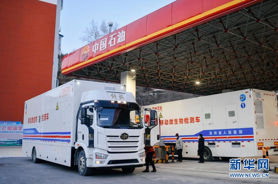 在位于吉林省通化市东昌区的中国石油秀泉加油站,加油站工作人员为移动微生物检测车加油(2月2日摄)。