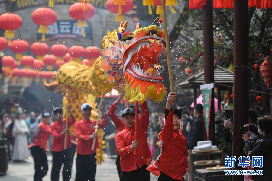 2月4日,游客在杭州宋城景区观看舞龙表演。