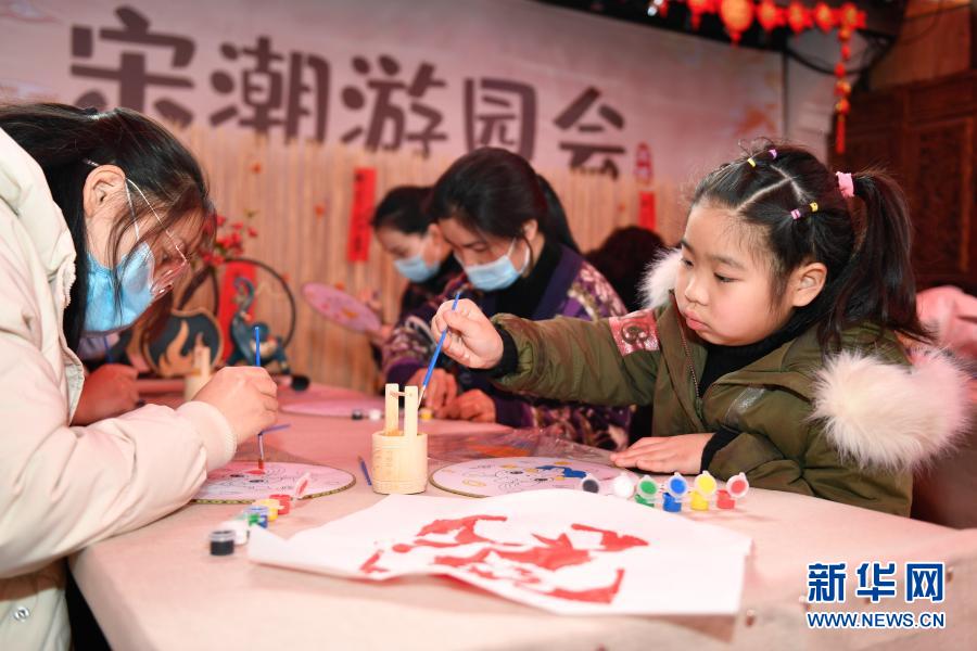 2月4日,游客在杭州宋城景区体验绘制团扇。
