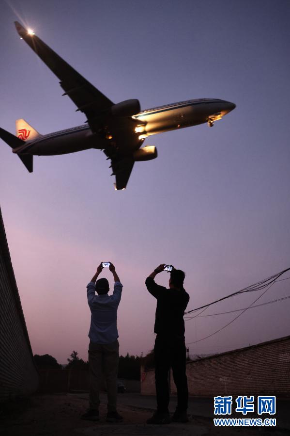 1月29日,机长王春萍(左)和空勤教员李军升在拍摄飞机。新华社记者 张丽芸 摄
