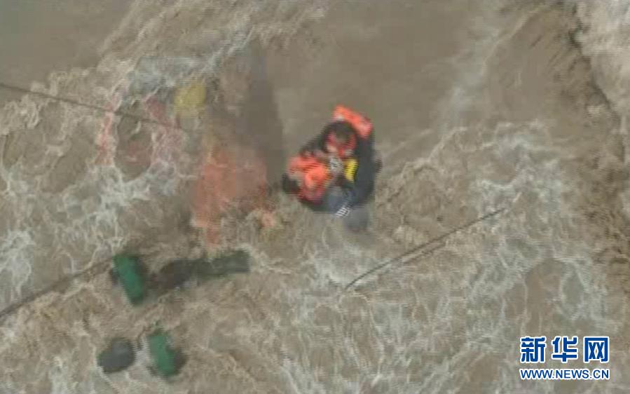 这是南海第一救助飞行队队员在珠海海域从一艘快沉没的船上救助遇险人员的资料照片(2011年9月29日摄)。新华社发