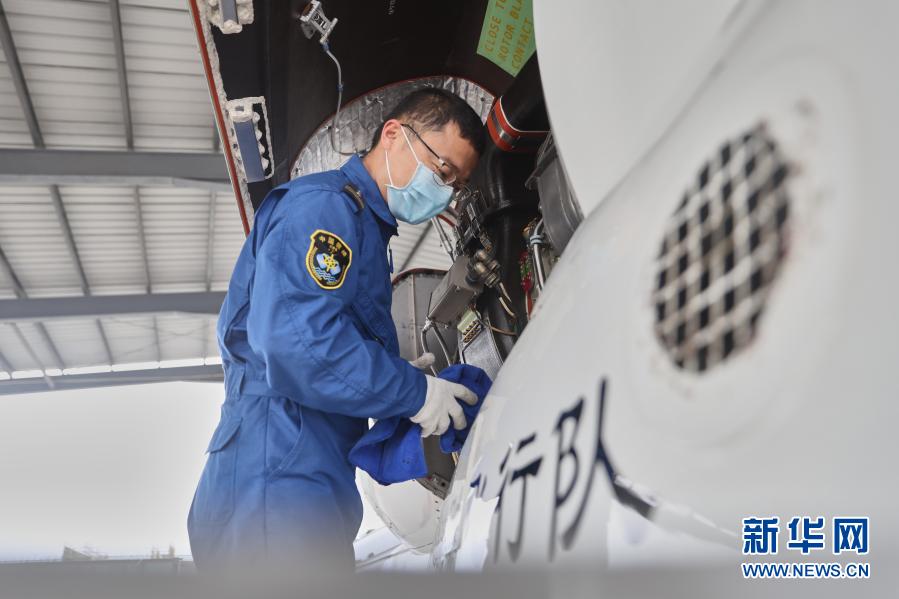 1月28日,南海第一救助飞行队的机械放行师彭龙给救助直升机做定检。新华社记者 张丽芸 摄