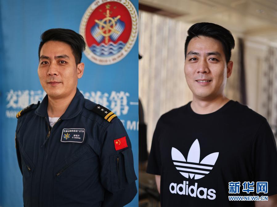 这是一张拼版照片:左图为南海第一救助飞行队的空勤教员李军升穿着工作服(1月30日拍摄);右图为李军升穿着便装(2月1日拍摄)。新华社记者 张丽芸 摄