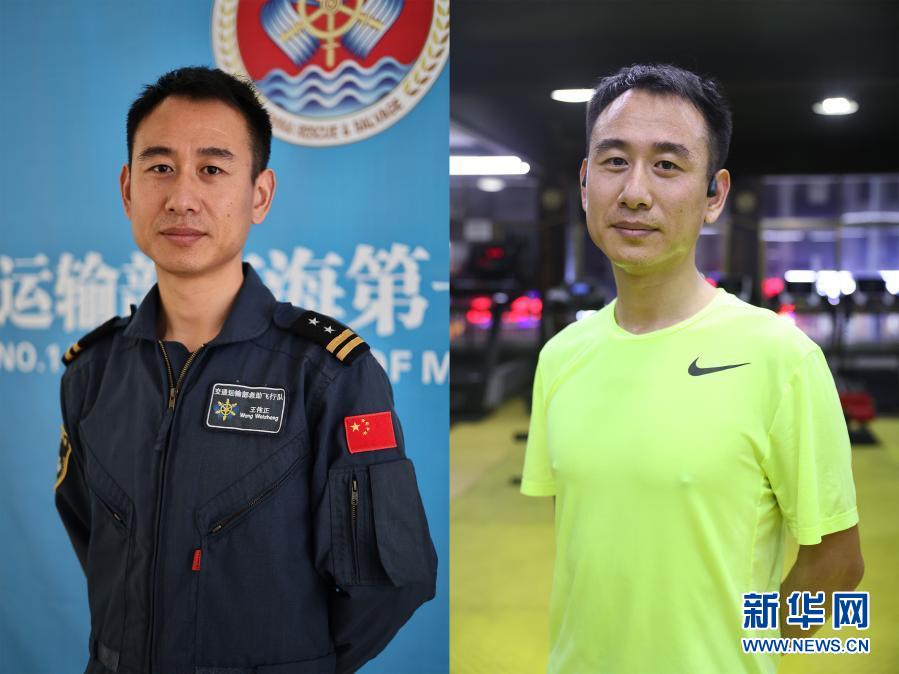 这是一张拼版照片:左图为南海第一救助飞行队的绞车手王伟正穿着工作服(1月30日拍摄);右图为王伟正穿着便装(1月30日拍摄)。新华社记者 张丽芸 摄