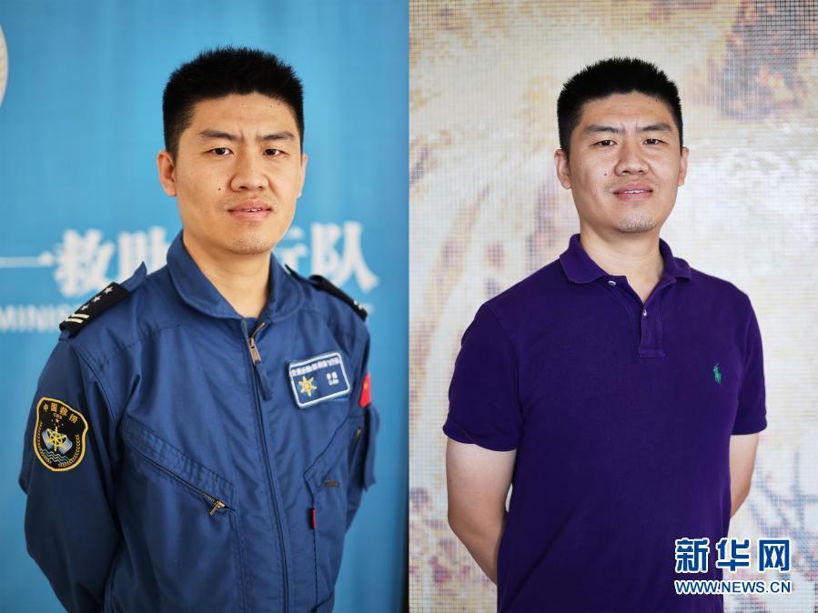 这是一张拼版照片:左图为南海第一救助飞行队的电子放行师李健穿着工作服(1月31日拍摄);右图为李健穿着便装(2月1日拍摄)。新华社记者 张丽芸 摄