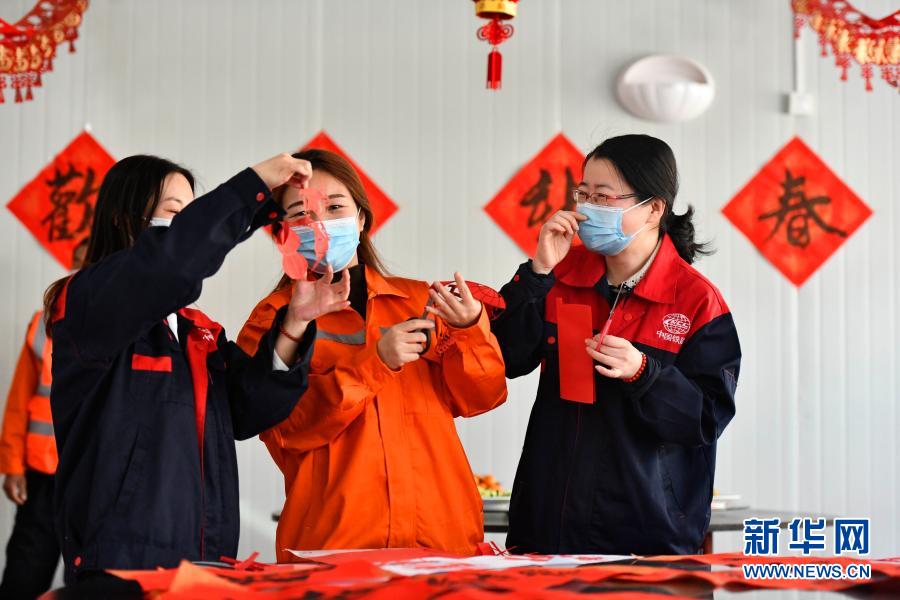 2月4日,中铁十八局的职工在建设工地生活区剪窗花。新华社记者 赵子硕 摄