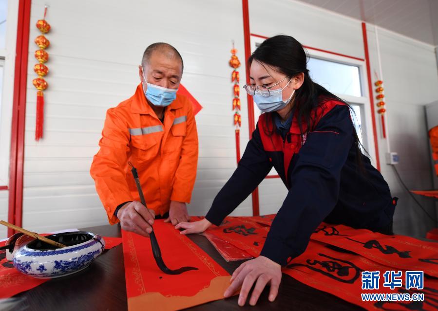 2月4日,一线建设者(左)在建设工地生活区写春联。新华社记者 赵子硕 摄