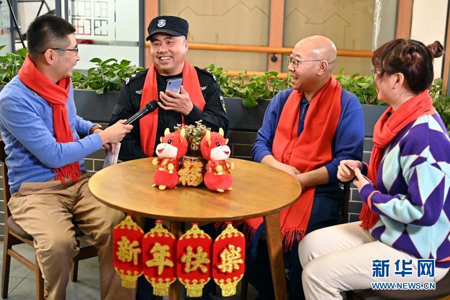 2月4日,在直播活动上,在京过年的大栅栏街道辖区保安宋军军(左二)与在老家山西省洪洞县的妻子和女儿连线,给家人报平安并送去新年祝福。