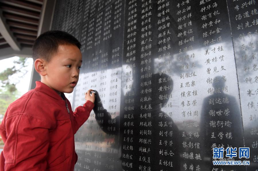 一名小朋友在广西兴安县红军长征突破湘江烈士纪念碑园浏览英烈名录(2月2日摄)。新华社记者 陆波岸 摄