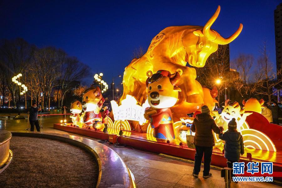 2月4日,市民在北京金融街欣赏“金牛贺岁”景观小品。新华社记者 彭子洋 摄