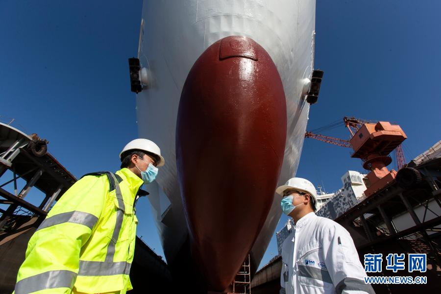 2月3日,在希腊比雷埃夫斯港修造船厂,中方员工马亮(右)和张保华检查船只维修进度。