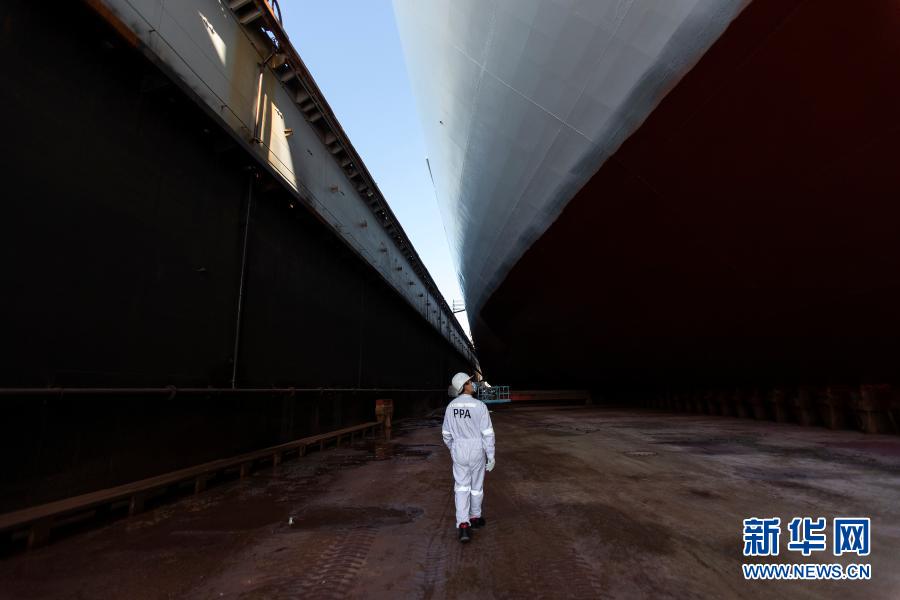 2月3日,在希腊比雷埃夫斯港修造船厂,中方员工马亮检查船只维修进度。