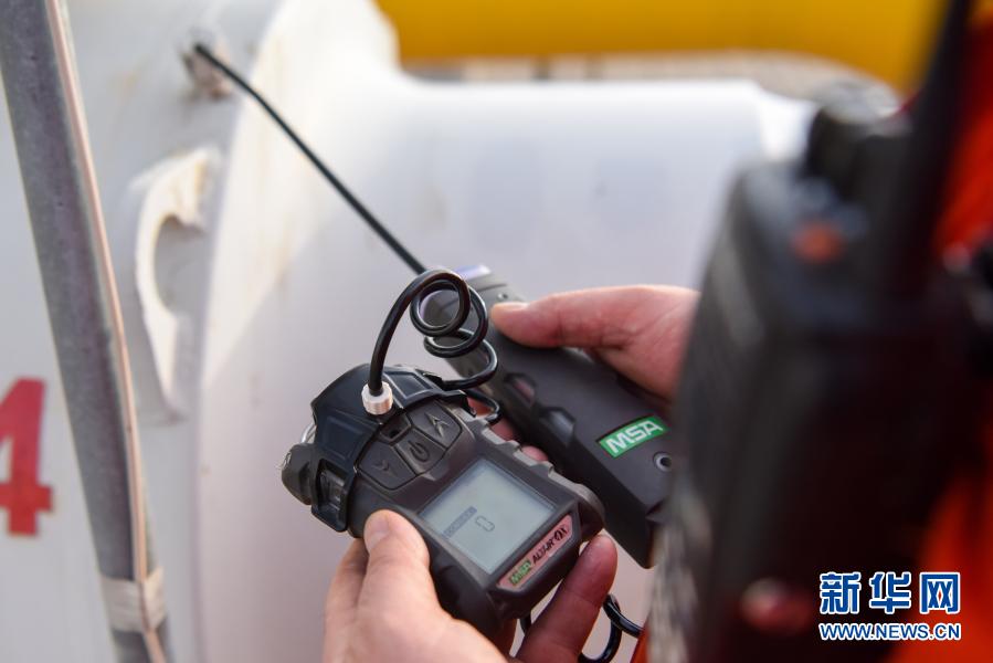 在霍尔果斯压气首站,运维人员通过可燃气体检测仪对设备进行密封检查(2月4日摄)。新华社记者 丁磊 摄