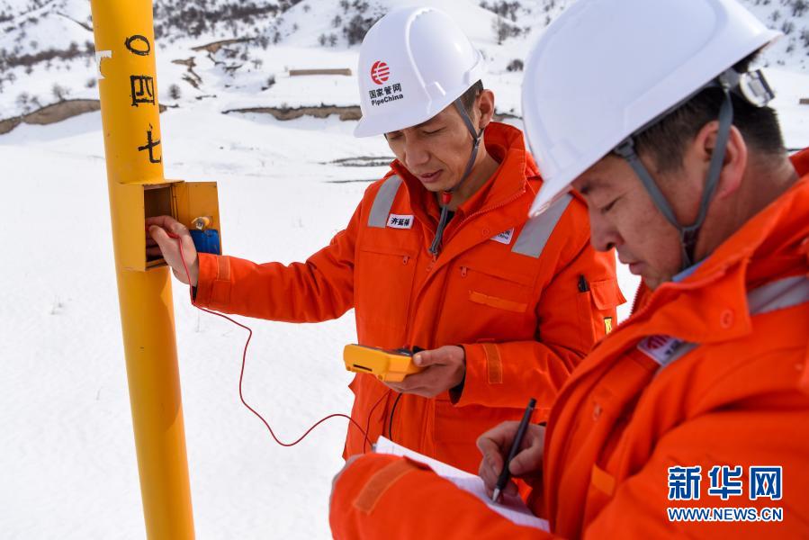 在西气东输二线果子沟段,管道巡护人员在测试阴极保护电位电压(2月4日摄)。新华社记者 丁磊 摄