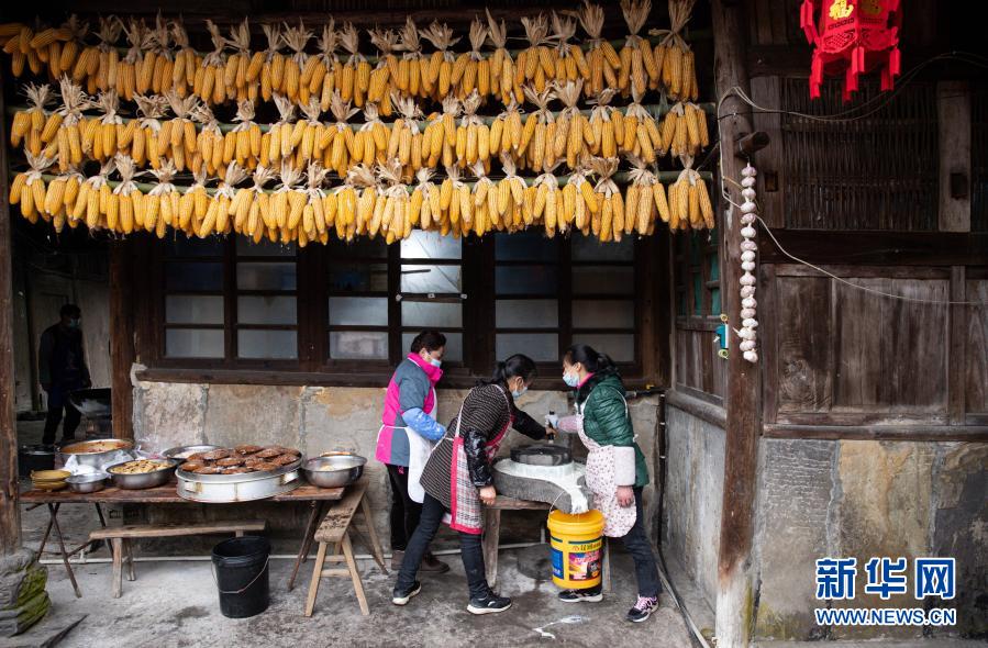 2月4日,李家大院的妇女们在磨豆浆。新华社记者 江宏景 摄