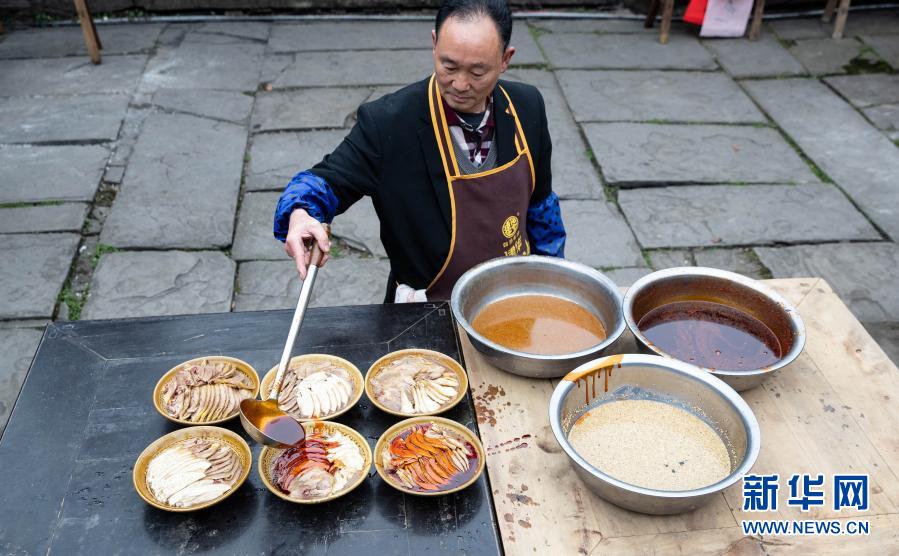 2月4日,在李家大院,一位厨师在做当地的传统名小吃——荥经棒棒鸡。新华社记者 刘梦琪 摄
