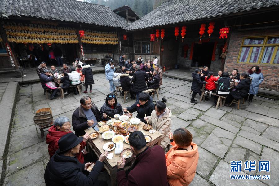 2月4日,李家大院的居民在吃“小年”团年饭。新华社记者 江宏景 摄