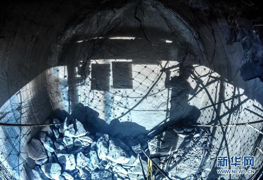 施工人员在进行TBM刀盘检修,攀爬的身影被焊接的光亮映射在隧洞掘进处(2月4日摄)。新华社记者 刘潇 摄