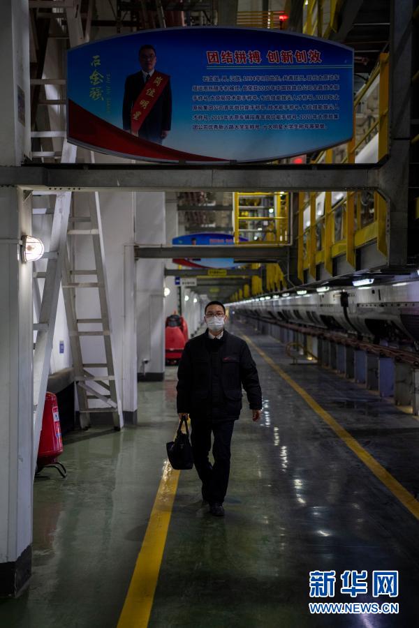 2月5日,在太原车辆段太原动车所,石金强领取作业工具包后准备上车作业。新华社记者 杨晨光 摄