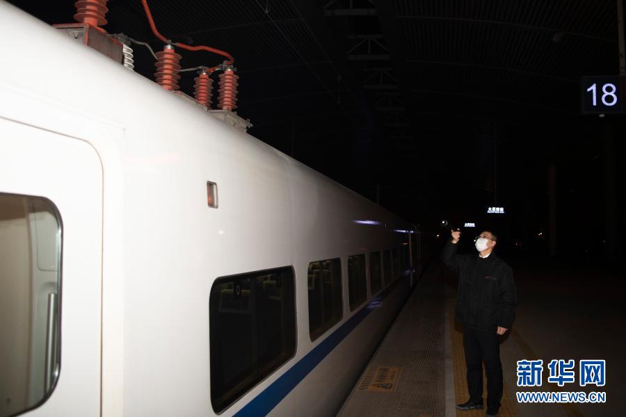 2月5日,在太原南站,石金强检查车顶受电弓。新华社记者 杨晨光 摄