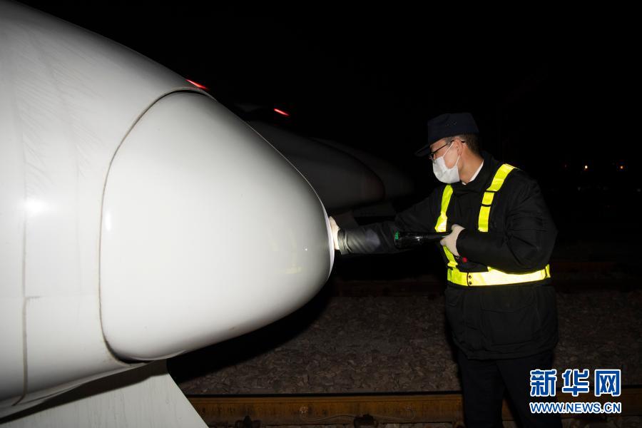 2月5日,石金强在列车出库前检查车头罩。新华社记者 杨晨光 摄