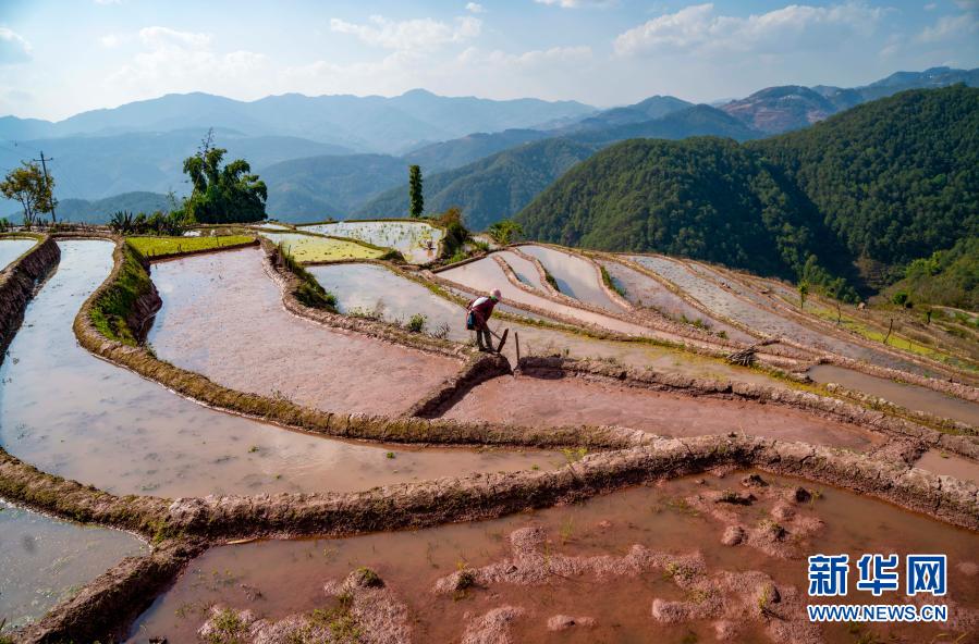 2月4日,一位农民在红河县三村乡南哈中寨梯田给梯田放水。新华社记者 陈欣波 摄
