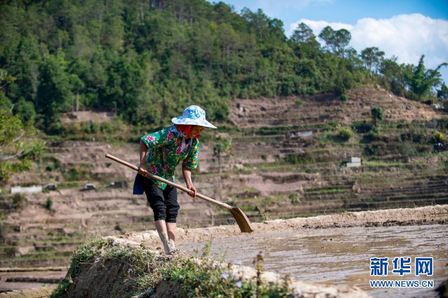 2月4日,一位农民在红河县三村乡南哈上寨梯田平整育秧田。新华社记者 陈欣波 摄