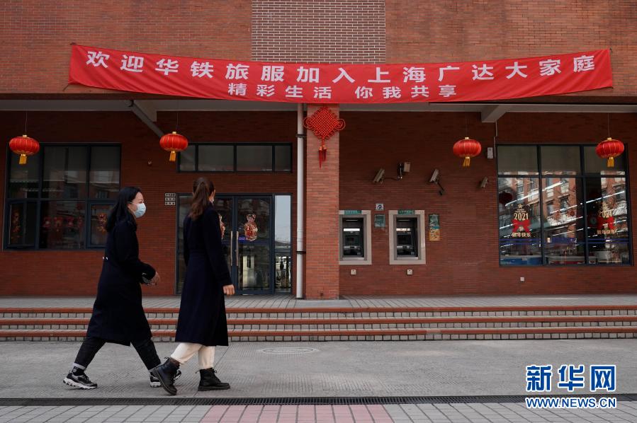 在广达上海制造城的生活区内,两名“共享员工”走在欢迎他们入住的条幅下(2月4日摄)。新华社记者 刘颖 摄