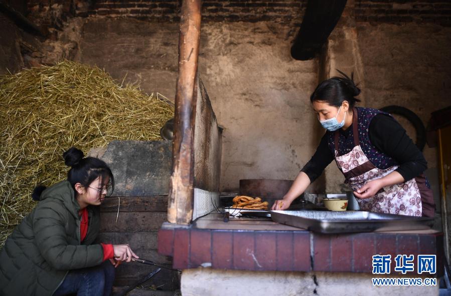 2月5日,白崖村村民李文芳(右)在制作盘馓。