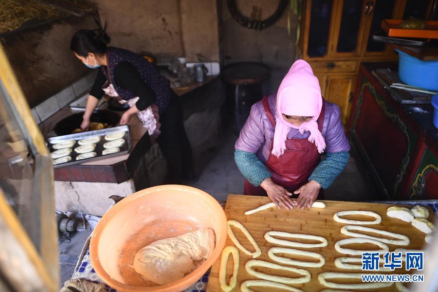 2月5日,白崖村村民李延菊(右)在制作盘馓。新华社记者张宏祥摄