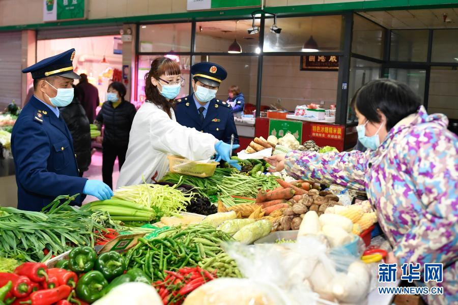 2月5日,吴兴区市场监督管理局八里店所工作人员与检测员在三合家园农贸市场对蔬菜进行取样,以进行农残超标检测,并向摊主了解进货来源。新华社记者 黄宗治 摄