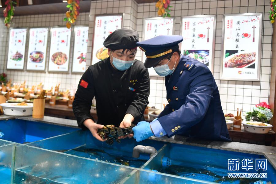 2月5日,吴兴区市场监督管理局八里店所工作人员在一家饭店检查水产的进货渠道。新华社记者 黄宗治 摄
