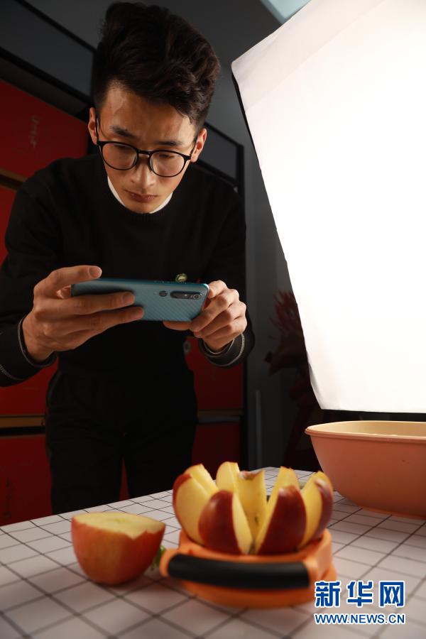 2月5日,团队成员吕王有为苹果产品做拍摄宣传。新华社记者 杜哲宇 摄