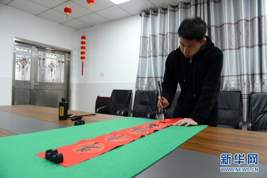 2月4日,在安徽工贸职业技术学院,河北石家庄籍学生武琛涛在为大家写春联。新华社记者 周牧 摄