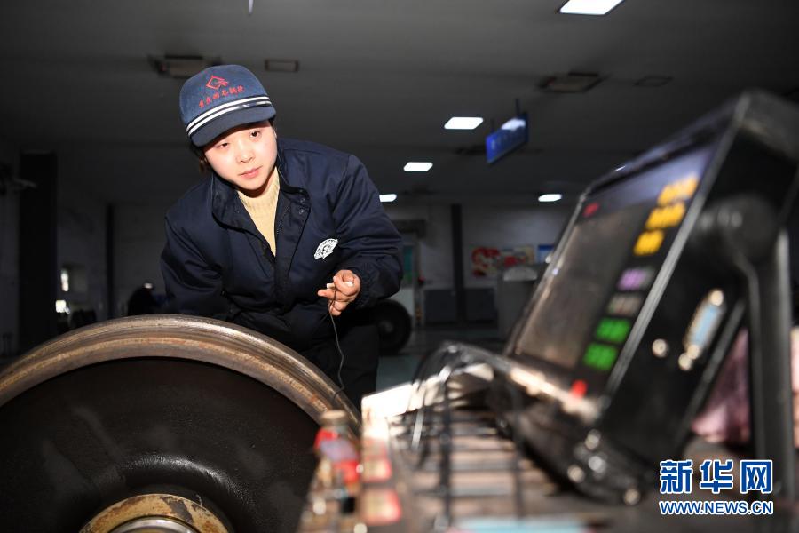 2月5日,重庆西车辆段探伤工在进行轮座镶入部超声波探伤。新华社记者 唐奕 摄