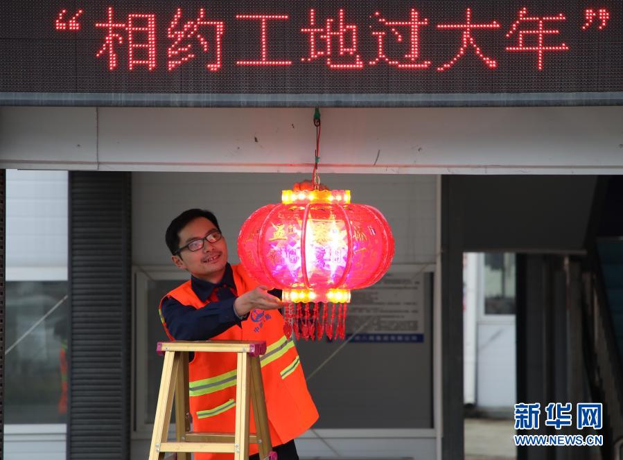 2月5日,中铁八局建设者在项目部挂灯笼。