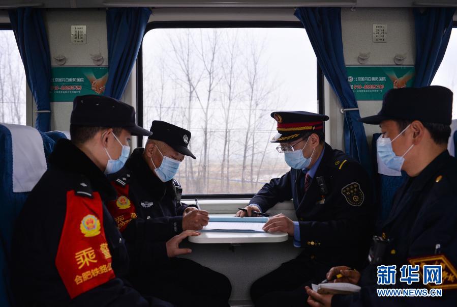 2月5日,在K8422次列车上,周彪(左二)和同事填写值班日志。