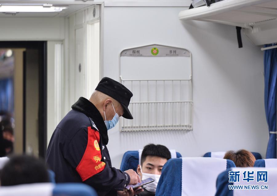2月5日,在K8422次列车上,周彪查验旅客身份。新华社记者 韩旭 摄