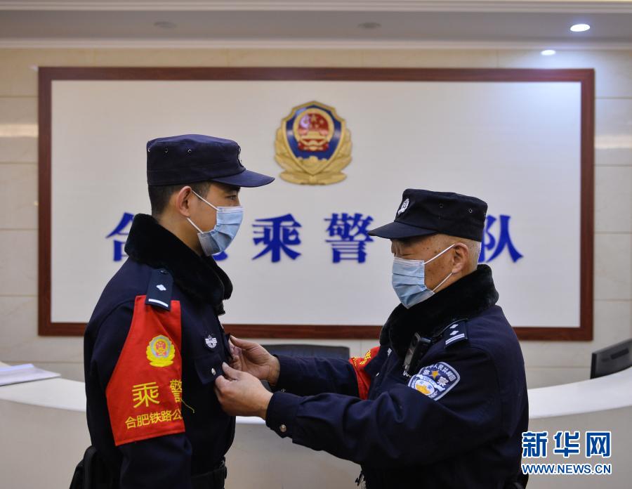 2月5日,在合肥铁路公安处乘警支队退乘点,周彪(右)为同事整理着装。新华社记者 韩旭 摄