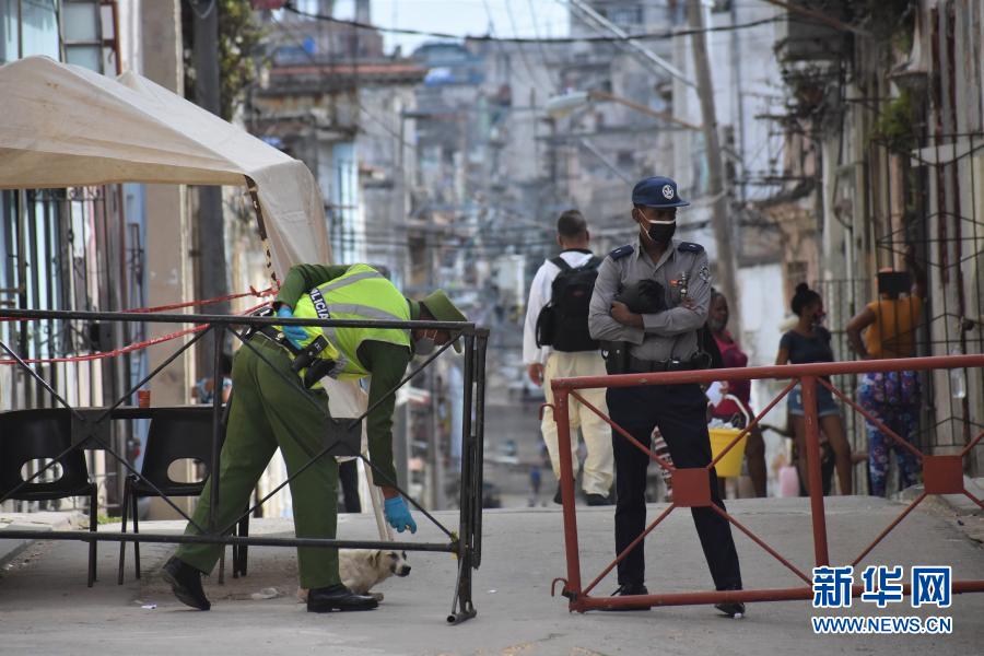 2月5日,警察在古巴哈瓦那一处因出现疫情而限制出入的街区内执勤。
