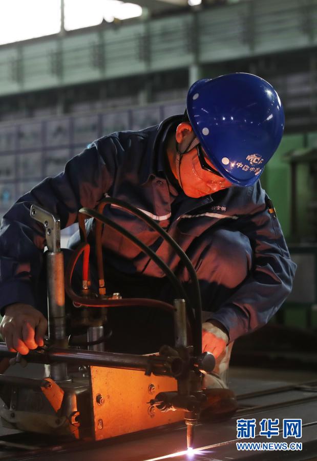 赵小龙使用半自动切割小车进行钢板切割作业(1月28日摄)。新华社记者 方喆 摄